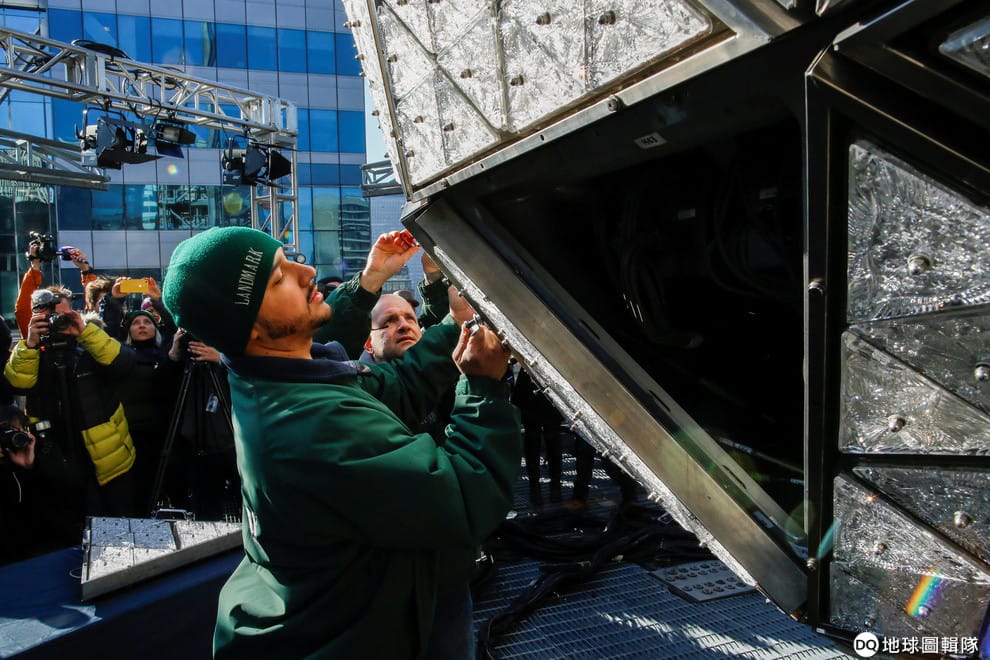 在紐約時代廣場,工人們正忙著把一片片三角水晶玻璃固定在水晶球場,為每年跨年夜的重頭戲──水晶球降球典禮做好準備。