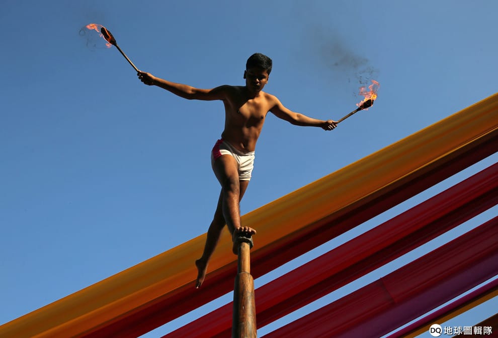 在孟買一所學院的慶祝活動上,一名男子手拿兩支火把表演印度傳統體操Malkhamb,這種體操融合了空中瑜珈和武術,表演者除了柔軟度要好外,身體還需要非常強壯。