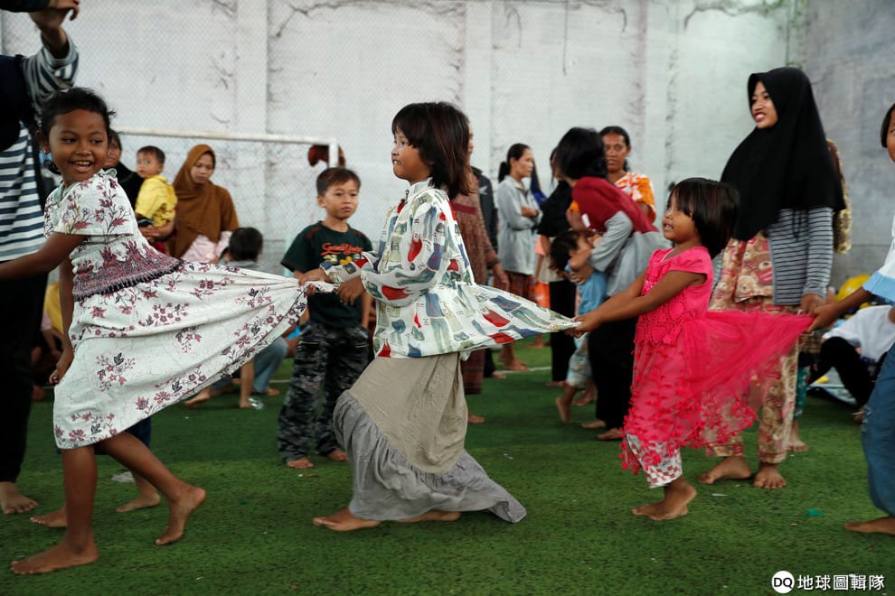 在受到海嘯重創的萬丹省(Banten province),無家可歸的孩子們在臨時避難所中玩耍。