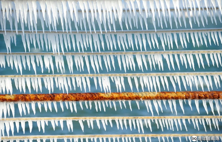在中國遼寧省大連市,天寒地凍的氣候把從欄杆上流下的水都凍成了冰柱。
