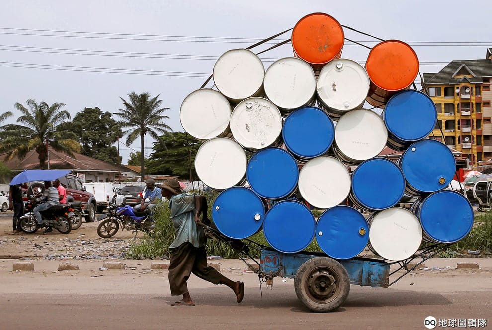 在首都金夏沙(Kinshasa),一名男子用小小的一輛推車載著十幾個大桶子前進。