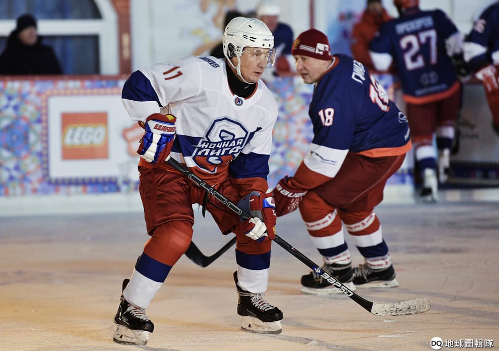 在位於莫斯科紅場的冰上曲棍球賽場上,俄國總統普亭(Vladimir Putin)全副武裝下場參賽。