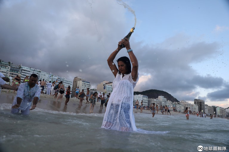 在里約熱內盧的海灘,民眾把白色鮮花拋入海中祈求海之女神Yemanja庇佑,相傳這位融合非洲與巴西文化的女神可以替人們帶來力量,所以每到新年時期,巴西民眾都會在海邊祈求女神庇佑,他們會把供品拋入海中,也會搭上小船在海上祈福。