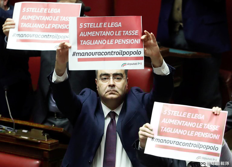 在首都羅馬的國會中,義大利民主黨議員手舉標語,要其他議員在投票決定預算案時多想一下,他手上的標語寫著「五星運動和北方聯盟增稅又大砍退休金」。