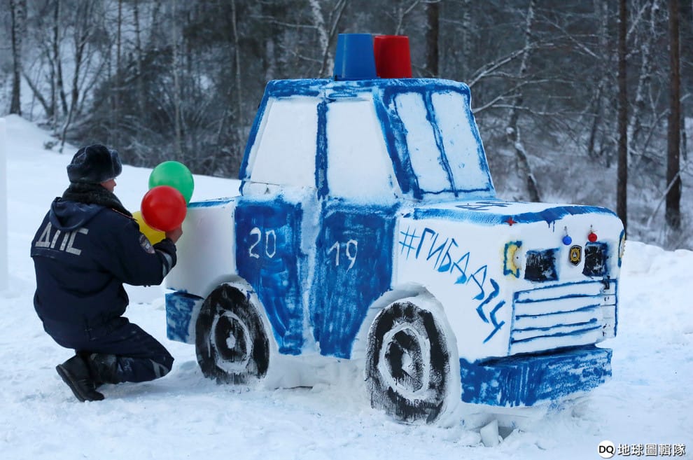 在克拉斯諾亞爾斯克(Krasnoyarsk)市攝氏零下 29度的環境下,一名警察正在裝飾他的冰雪警車,準備待會參加一年一度的「雪人大遊行」,隨後民眾還會在眾多雪人中,選出最別具心裁的雪人。