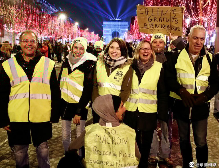 在巴黎凱旋門前的香榭大道上,穿著黃背心的抗議民眾在慶祝跨年的同時,也不忘露出背心後的標語抗議社會貧富不均,只見上頭寫到「馬克宏(Emmanuel Macron)下台,富人的總統、窮人的殺手」。