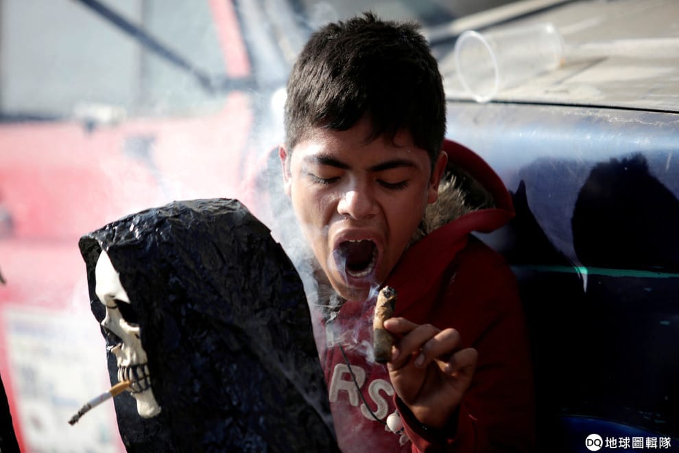 在墨西哥市,一名男子和死亡聖神(La Santa Muerte)的雕像一起吞雲吐霧。死亡聖神是墨西哥民間信仰的女神,祂通常是一具穿著長袍,手拿鐮刀和地球儀的骷髏,具有神聖的治癒力,並且能夠保護信徒來世的安全。