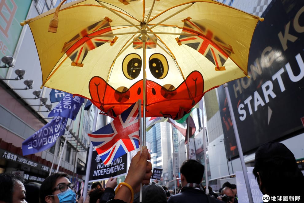 在香港慶祝新年的遊行活動上,一名支持香港獨立的民眾撐著貼有英國國旗的黃傘上街。