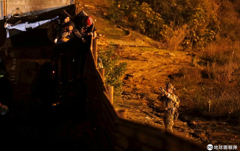 在美墨邊界的提華納城(Tijuana),一名美國海關及邊境保衛局的成員持槍瞄準非法越境的移民。