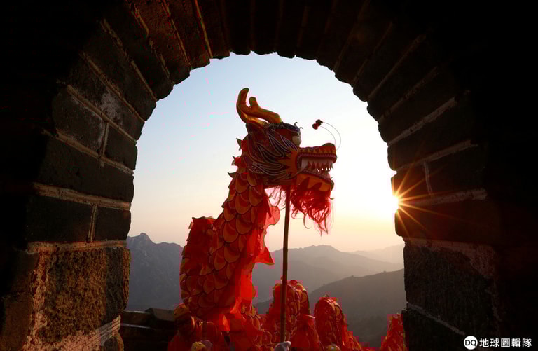 在北京懷柔區的慕田峪長城,民眾帶著舞龍一起慶祝新年的到來。