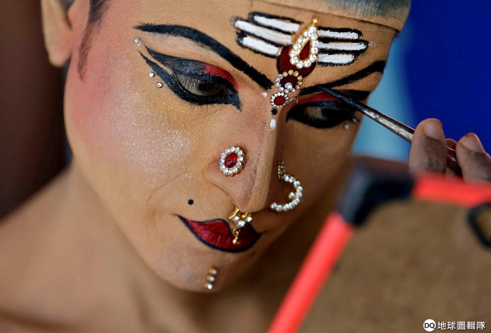 在印度南部的喀拉拉邦(Kerala State),一名男子對著鏡子化妝,準備參加當地的新年嘉年華。