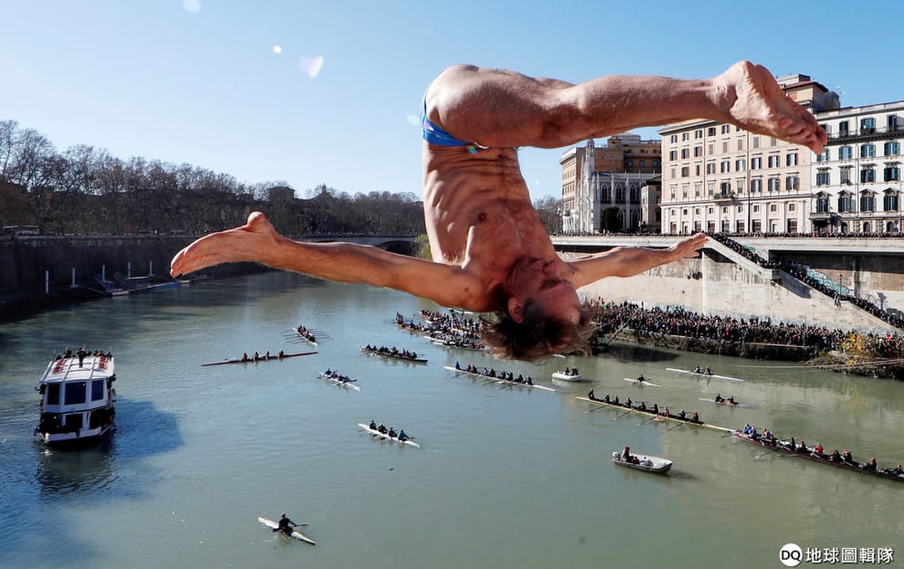 在羅馬加富爾橋(Cavour bridge),一名男子縱身跳入台伯河(Tiber River),完成傳統新年慶祝活動。