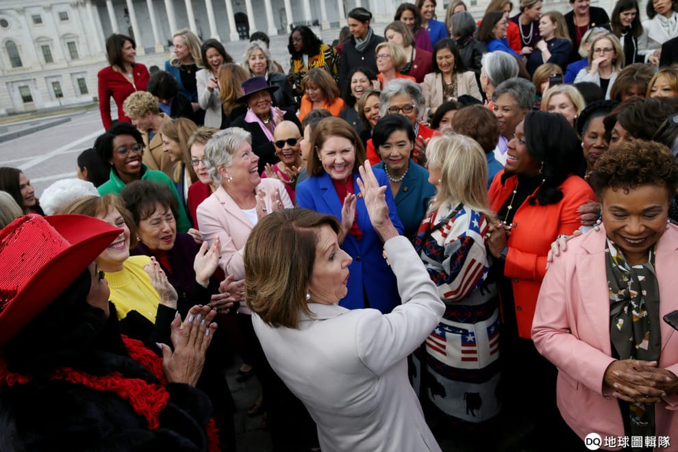 在華盛頓特區的國會山莊,剛剛就任第 116屆國會眾議院議長的裴洛西(Nancy Pelosi)招呼其他新科女議員一起拍照。