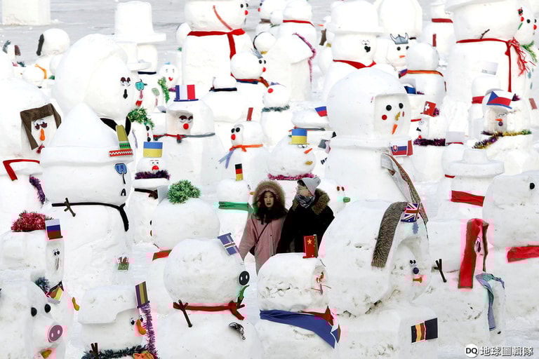 在黑龍江省的哈爾濱,一對情侶走在 2019尊雪人之間,欣賞這些放有不同國家國旗的雪人。