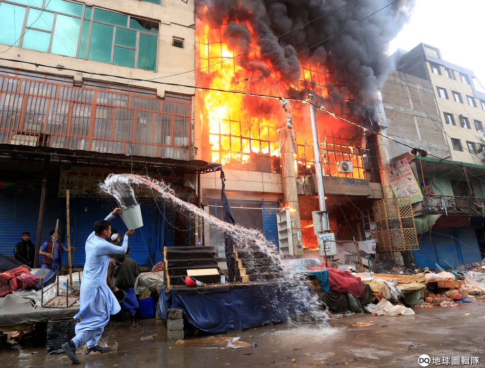 在阿富汗東部的賈拉拉巴德市(Jalalabad),民眾提著水搶救在市場內一棟慘遭祝融的房子。