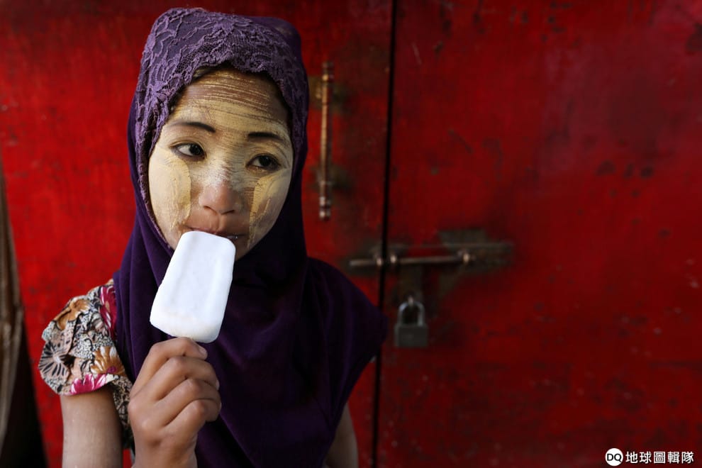 在仰光,一名臉上塗有檀那卡(Thanaka)的小女孩一邊吃冰,一邊慶祝緬甸脫離英國殖民 71年。1948年1月4日,緬甸正式脫離英國獨立。