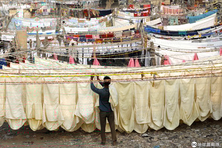 在巴基斯坦南部的喀拉蚩(Karachi),一名洗衣工在露天洗衣場中處理一排又一排洗好的衣服和床單。