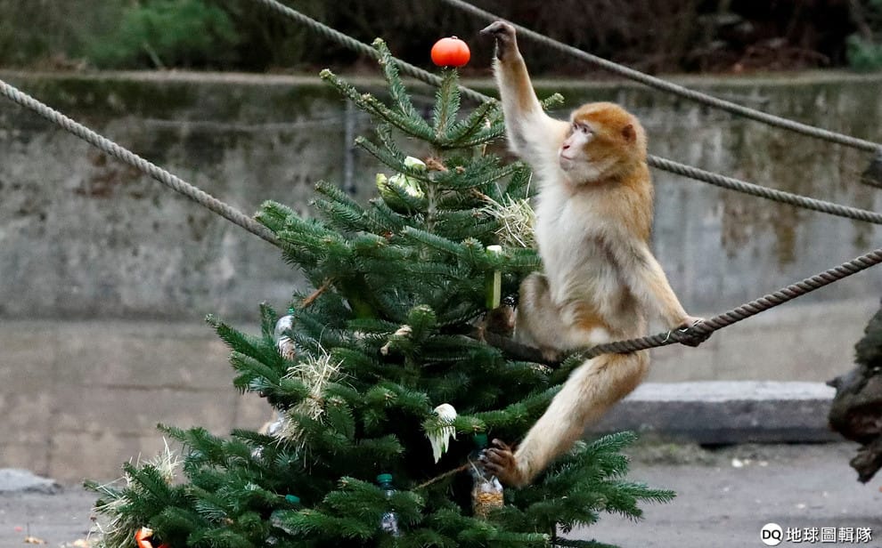在柏林動物園,一隻獼猴和聖誕節還沒收走的聖誕樹玩得不亦樂乎。