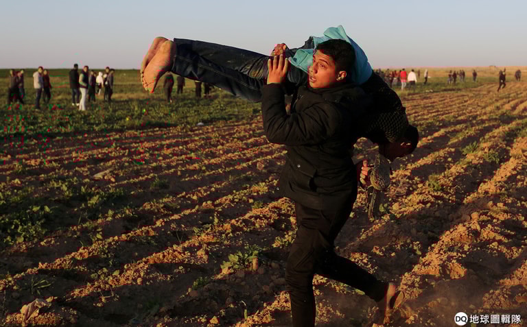 在加薩走廊,一名巴勒斯坦示威者扛著受傷的同伴離開現場,這裡是巴勒斯坦和以色列發生衝突的第一線。