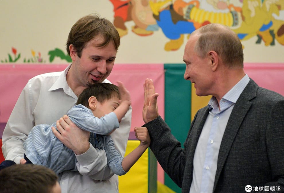 在聖彼得堡的兒童安寧病房內,俄國總統普亭(Vladimir Putin)和孩子擊掌。