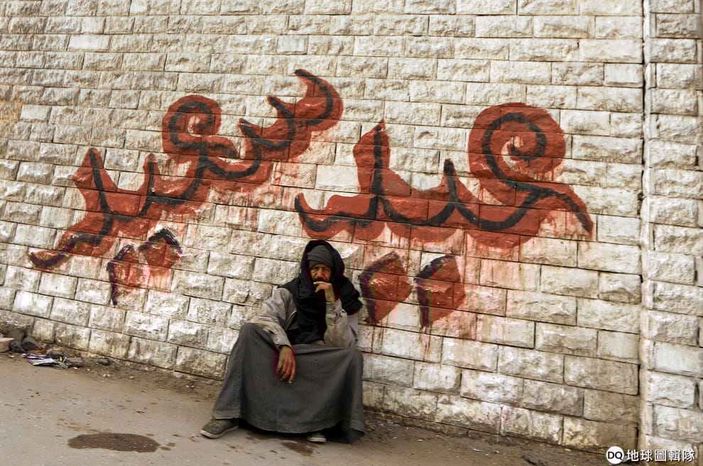 在首都開羅,一名男子靠著繪有「齋戒快樂」字樣的塗鴉牆而坐,等待沙塵暴過去。