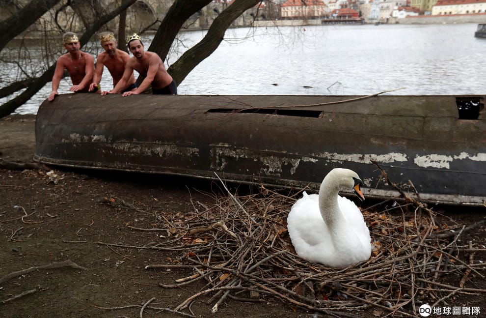 打扮成東方三賢士的民眾躲在一旁看著巢中的天鵝,這是主顯節慶祝活動的一環,參加民眾還會泳渡伏爾塔瓦河慶祝。