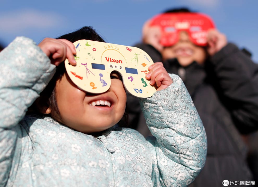 在東京晴空塔,孩子們拿著特製眼鏡觀賞日蝕。