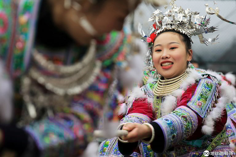 在廣西壯族自治區的融水苗族自治縣,苗族少女穿著傳統服飾,在慶祝新年的拔河活動上大展身手。