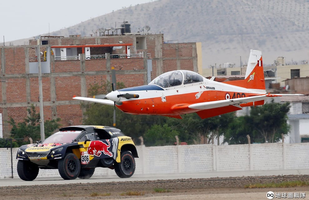 在一年一度的達卡越野拉力賽(Dakar Rally)上,法國著名賽車手勒布(Sebastian Loeb)駕著越野車和飛機賽跑,表演給大家看。