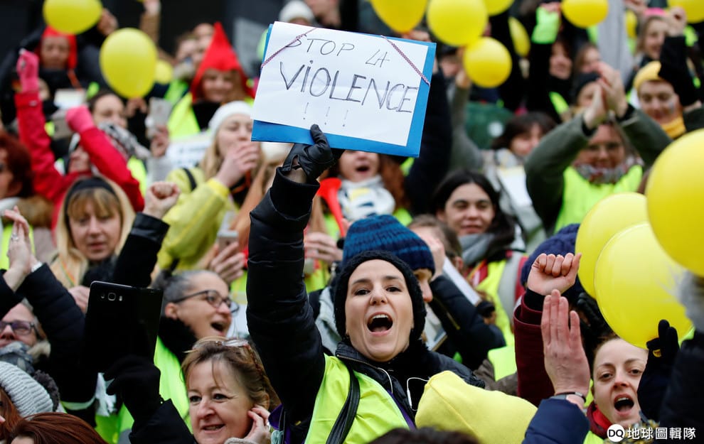 6號這天,巴黎街頭出現了許多身穿黃背心的女性,她們手持標語為女性發聲,呼籲社會停止對女性的暴力。