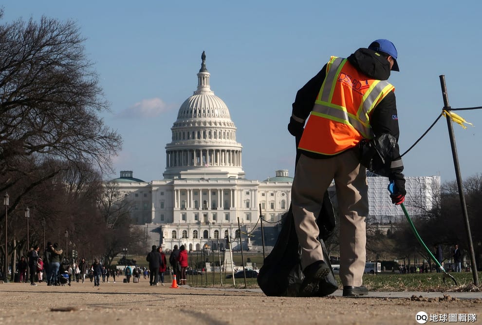 在華盛頓特區的國家廣場,一名清潔工對著國會山莊的雄偉建築撿垃圾。