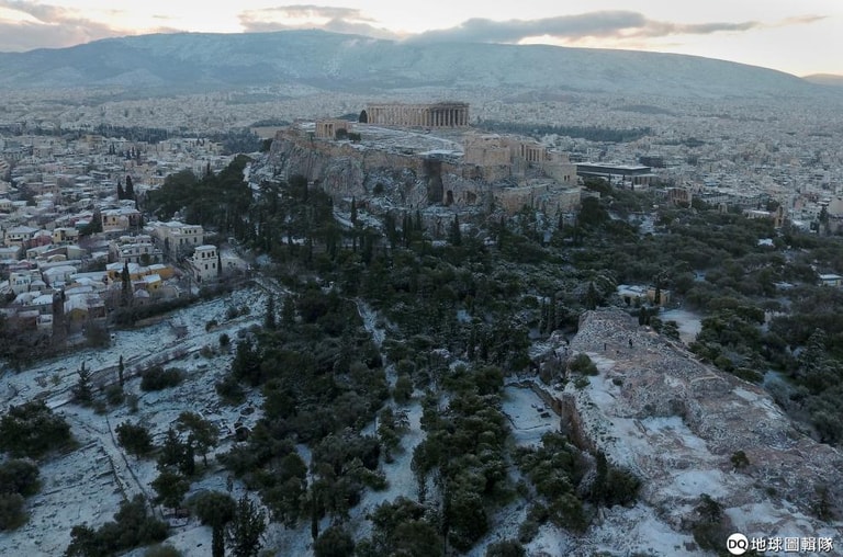 希臘遭逢寒流來襲,讓畫面中的帕德嫩神廟(Parthenon temple)被蓋上了一層積雪。