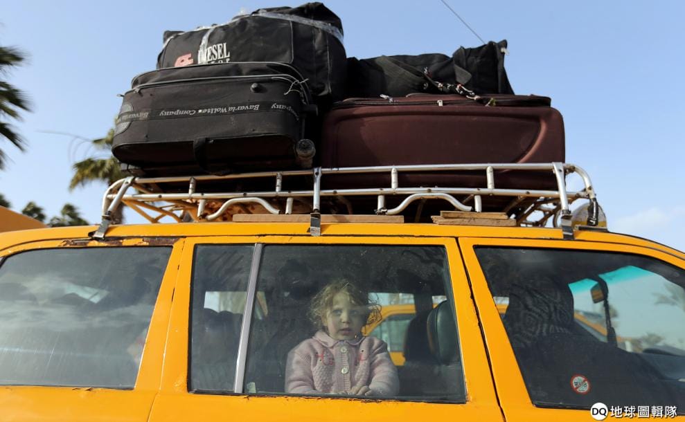 在加薩走廊和埃及間的拉法邊界(Rafah border),一名巴勒斯坦小女孩和她的家人搭車返回位於加薩走廊的住處。