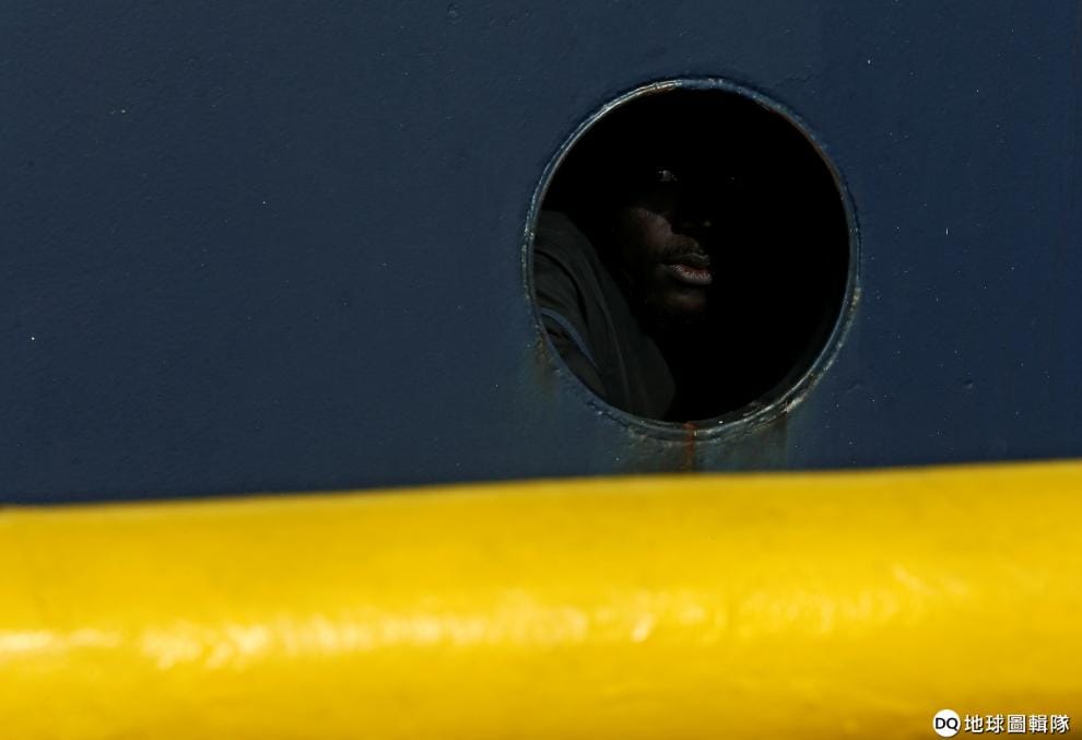 一名來自非洲的移民透過救援船的舷窗,探視著外頭的狀況。