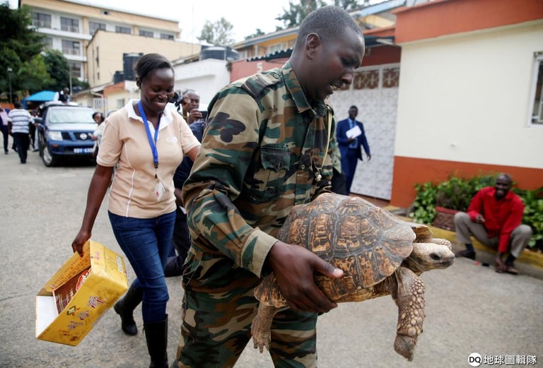 肯亞野生生物服務署的官員一把扛起烏龜離開現場,他們剛剛破獲了由中國人經營的非法走私活動,走私品包含象牙等動物製品。