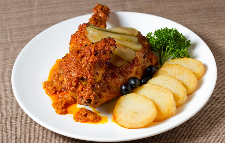 剛剛提到土生葡菜中,也有融合非洲料理的精華,最能代表的菜餚就是「非洲雞」(galinha à Africana)。首先,廚師會先用非洲鳥眼辣椒製作的Piri Piri辣醬醃製雞肉,隨後再將雞肉拿去烤,獨有的那股香辣勁令人齒頰留香。