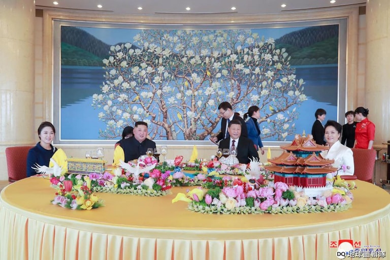 在《朝鮮中央通訊社》(KCNA)於本月 10號公布的照片中,記錄下北韓領導人金正恩與妻子李雪主、中國領導人習近平與妻子彭麗媛一同餐敘的畫面。
