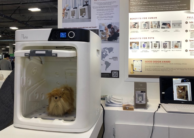有養寵物的人就知道,幫寵物洗澡最麻煩的就是吹乾,少則半小時多則要花上一兩個小時,在清潔上造成寵物主的負擔。同樣來自韓國的廠商 Pepe,針對小型犬開發出自動毛髮乾燥設備,內部設置負壓系統,持續提供乾燥的新鮮空氣進入,此外,門的表面形成空氣通道,避免內部缺氧並防止寵物的毛髮跑到外面,狗狗在裡面可以舒服自在的休息等待毛髮乾燥。
