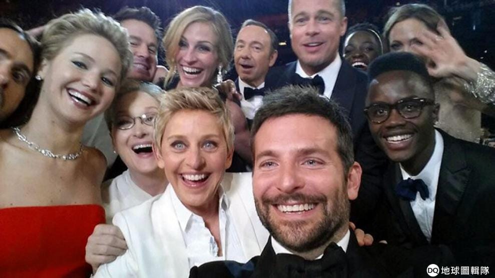 圖為 2014年奧斯卡金像獎頒獎典禮,艾倫狄珍妮號召知名演員們一起玩自拍,讓這張號稱「史上最強大的自拍照」在短短 45分鐘內,就在Twitter上轉推 100萬次。最後更以 330萬次以上的轉推數,一度成為Twitter排行榜上第一名。