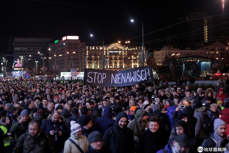 看不見盡頭的人潮聚集在首都華沙(Warsaw)街頭,悼念在慈善活動中遇害身亡的格但斯克(Gdansk)市長亞當維茲(Pawel Adamowicz),畫面中則有人拿著「阻止仇恨」的標語。