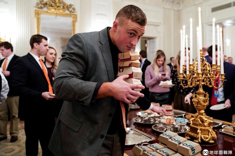 本月 14號,白宮邀請了美國大學 2018年足球冠軍克勒姆森老虎隊到國家國宴廳(State Dining Room)用餐,然而美國總統川普(Donald Trump)表示,由於部分政府機關停擺、上萬名聯邦政府工作人員包括白宮廚師都在放無薪假,所以他決定自掏腰包宴請球員來自麥當勞、溫蒂漢堡、漢堡王這些「很棒的美國食物」。