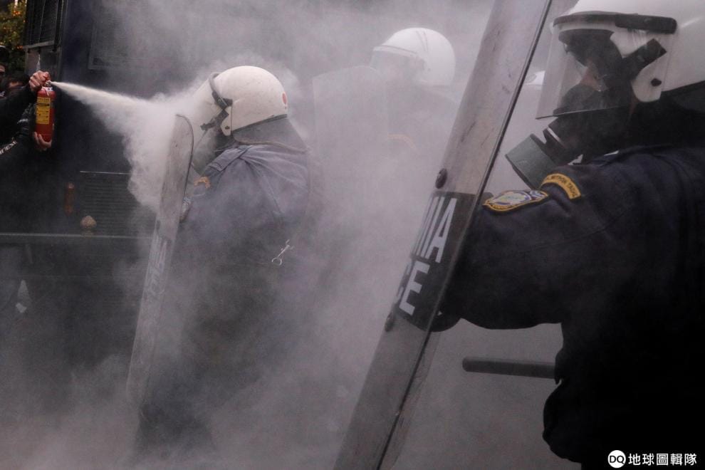 在國會大樓外,示威者用滅火器和鎮暴警察相互對峙,他們不滿政府計畫要改變公立學校的僱用程序,才會走上街頭抗議。