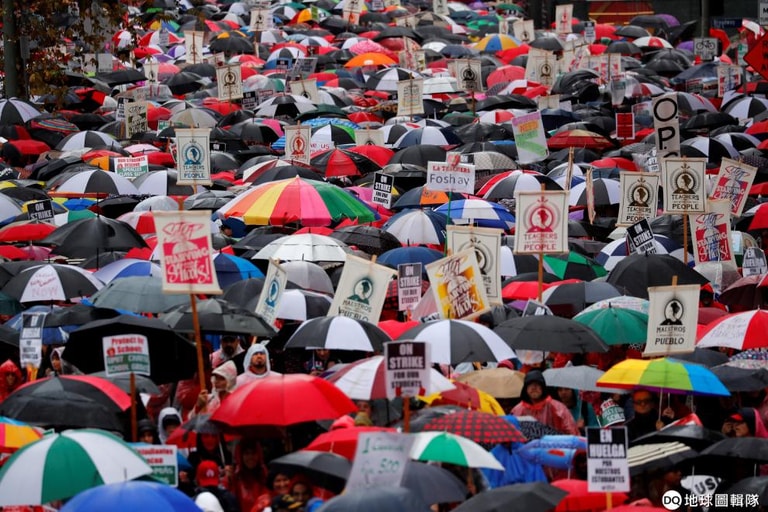 在洛杉磯,約 3萬名學校老師聚集在市政廳罷工抗議,呼籲政府提供更好的薪資待遇、健康保障等。
