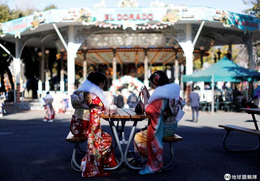 在豐島園兒童樂園,兩名穿著和服的女子準備要去參加成人式。