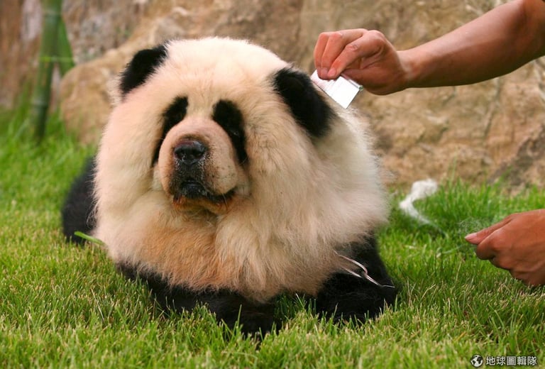 2010年當時,位在河南省的大河民粹公園要替新開幕的寵物公園造勢,特地在當地的寵物市場買來4隻染色的狗狗,原本應該是棕褐色的鬆獅犬,全成了貓熊的外貌。照片中的小動物不是甚麼貓熊,而是被特意染成這樣外貌的小小鬆獅犬!