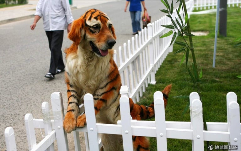 兩種狗狗互相看著被染成別種動物的對方