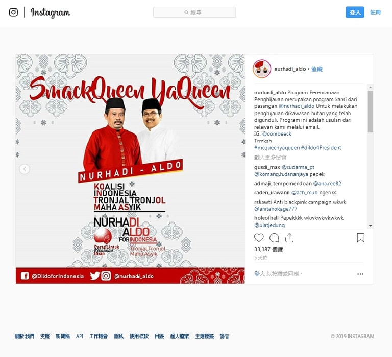 不過現在,如果詢問印尼網友,網路上呼聲最高的候選人是佐科威還是蘇比安托,他們會給出另一組答案:正副總統唯一支持努哈迪(Nurhadi)和阿爾多(Aldo)!