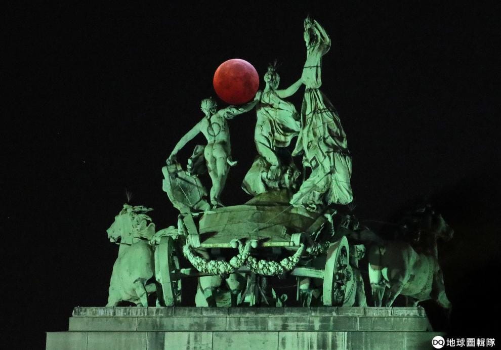 21號這天,一輪「超級血狼月」(Super Blood Wolf Moon)高掛布魯塞爾五十周年紀念公園上方,與拱門上的雙輪戰車雕像相映成趣。「超級血狼月」是「狼月」(Wolf Moon:一月的滿月稱為狼月)、血月(Blood Moon:月亮呈現鐵鏽紅色)和「超級月亮」(Super Moon:月亮剛好在滿月時離地球最近)三合一的天文奇景,更是許多天文迷引頸期盼的賞月機會。