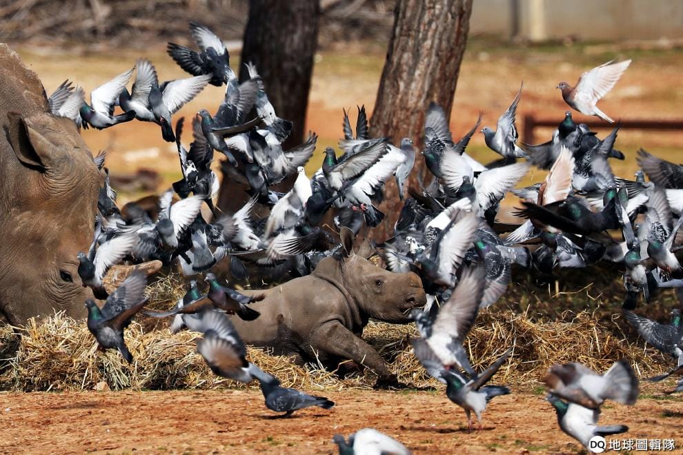 在拉馬干(Ramat Gan)野生動物園,年僅三周的小白犀牛好奇地往成群起飛的鴿子撲去,牠的母親貝莉絲(Karen Peles,圖左)則在一旁陪伴。