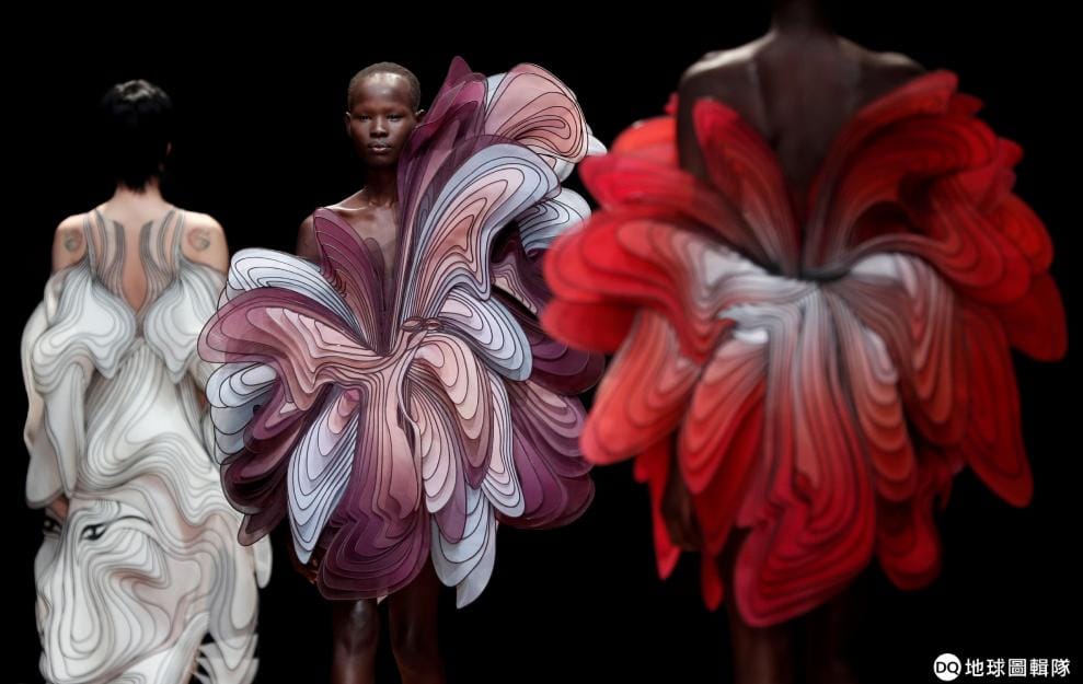 在巴黎時裝發表會現場,模特兒正在展示荷蘭設計師范荷本(Iris van Herpen)的春夏高級訂製服系列。